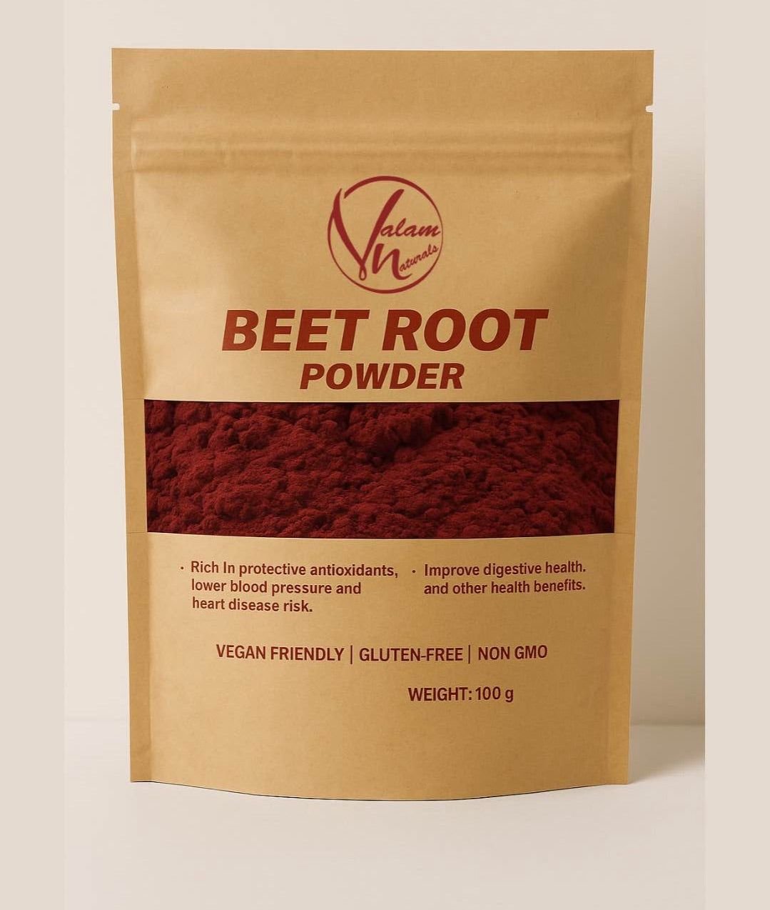 DescriptionNatural Beetroot Powder 100g | For Glowing Skin, Pink Lips, Healthy Hair & Daily Nutrition | Pure And Organic Drink Mix SuperfoodDiscover The Natural Goodness Of Beetroot With This 100% Pure And Organic Beetroot Powder. Rich In Essential Nutrients, Antioxidants, And Vitamins, It Helps Brighten The Skin, Enhance Lip Color, And Strengthen Hair Naturally. Regular Consumption Promotes Blood Circulation, Detoxifies The Body, And Boosts Overall Energy Levels. This Versatile Superfood Can Be Mixed With Water, Milk, Smoothies, Or Juices For A Refreshing And Healthy Drink. Ideal For Daily Use To Maintain Natural Beauty And Vitality From Within.Key Features:100% Pure And Natural Beetroot PowderEnhances Skin Glow And Brightens ComplexionPromotes Naturally Pink And Healthy LipsStrengthens Hair And Boosts ShineImproves Blood Circulation And DetoxificationRich Source Of Iron, Vitamins, And AntioxidantsPerfect For Mixing In Water, Milk, Or SmoothiesIdeal For Daily Health And Beauty MaintenanceNet Weight: 100 Grams